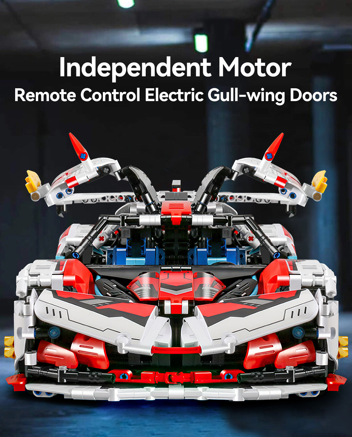 • 【A rewarding building project】This remote control sports car model was created with 2277 blocks and includes all the real design details of the sports car. The car adopts high speed motor, electric gullwing doors, patented special drift wheels, four-wheel drive, etc.