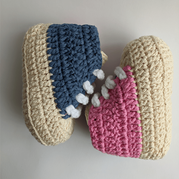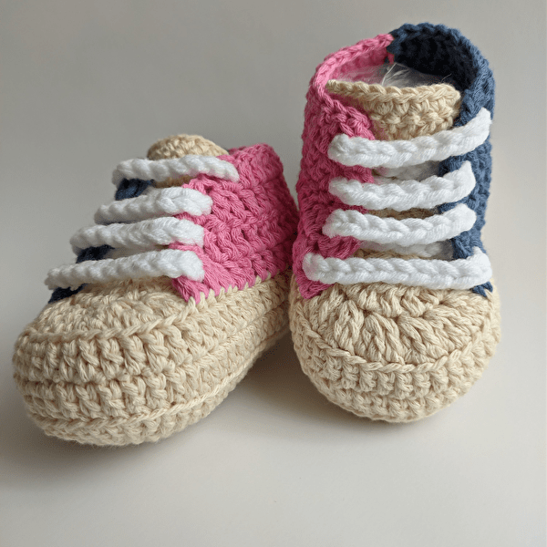 Adorable hand-crocheted baby sneakers in soft cream, pink, and navy. Cute sporty design with cozy texture and playful lace-up style. Perfect for tiny feet and stylish little ones!