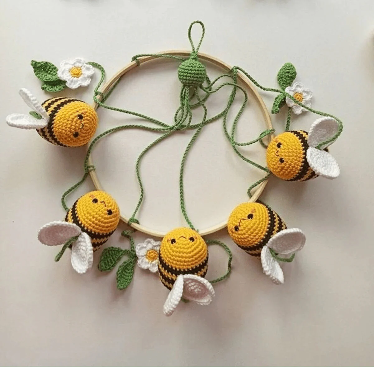Buzz into nursery cuteness! Handcrafted crochet mobile featuring adorable bumblebees and delicate white daisies. Soft, whimsical design that'll delight and soothe your little one with charming nature-inspired details. Perfect nursery decor!