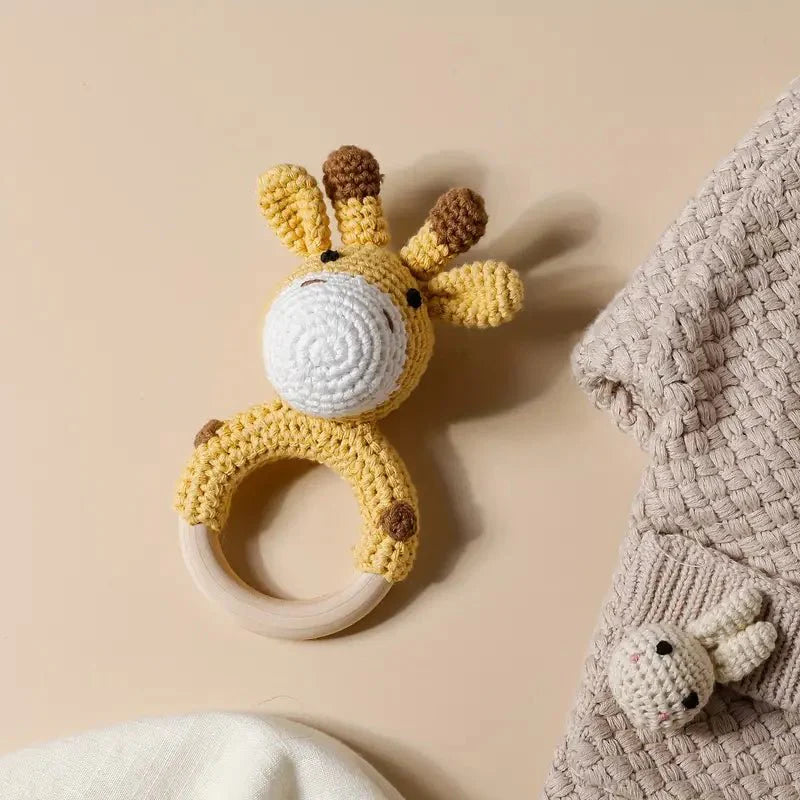 Adorable hand-crocheted giraffe rattle with a soft wooden ring. Charming yellow and brown design delights babies with gentle bell sounds and tactile texture. Perfect for sensory play and cuddling!