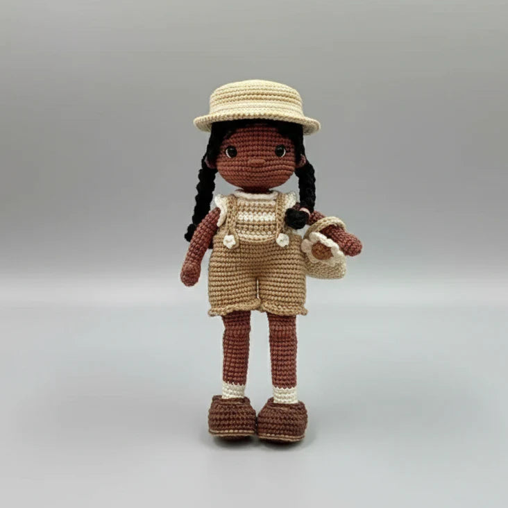 Adorable handmade crochet doll with dark hair, braided pigtails, and a charming straw hat. Dressed in stylish overalls and carrying a cute basket, this unique toy brings warmth and creativity to playtime. Perfect gift for imaginative girls!