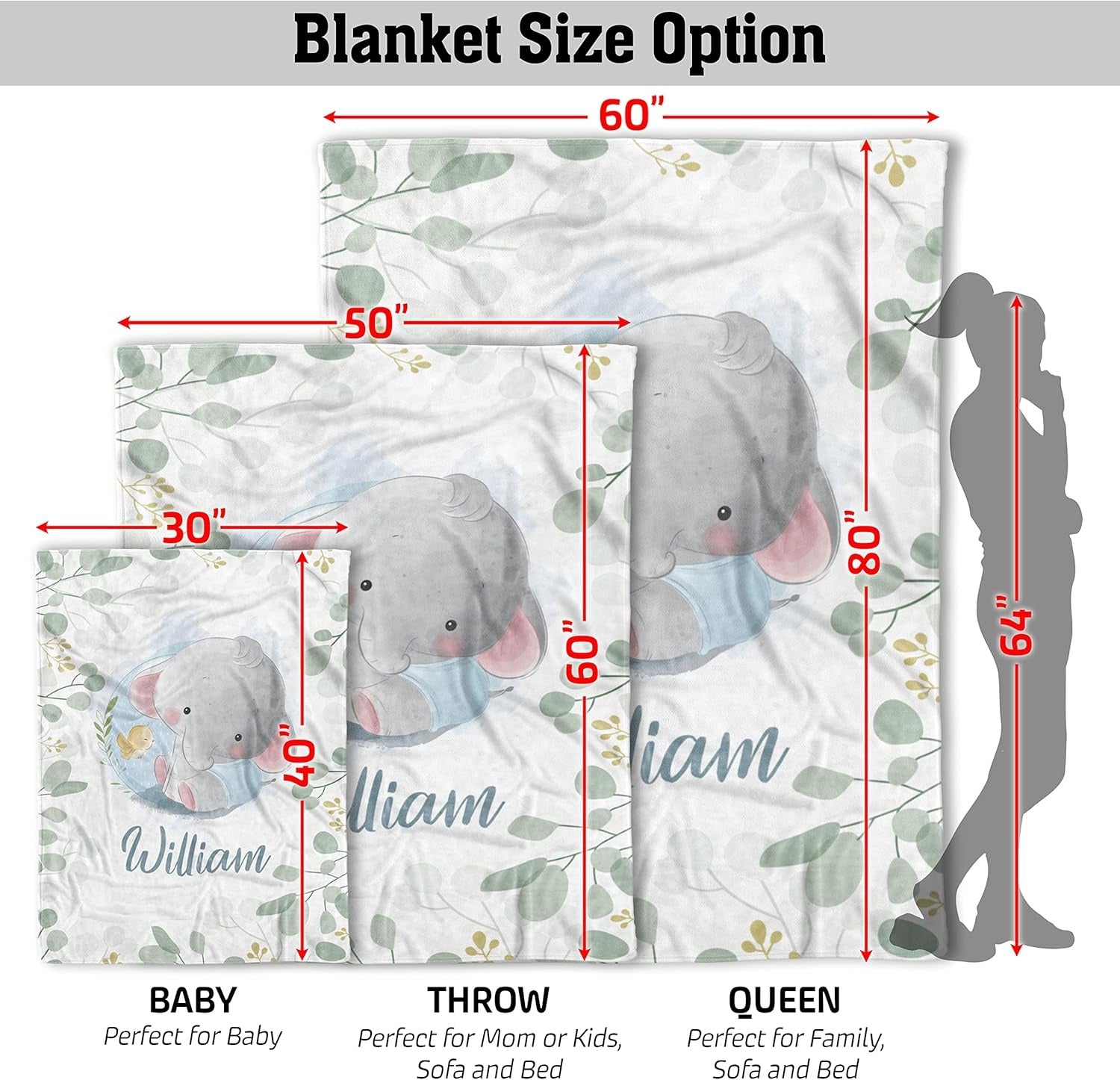 • Available in 3 sizes: Baby (30"x40"), Throw (50"x60"), Queen (60"x80")