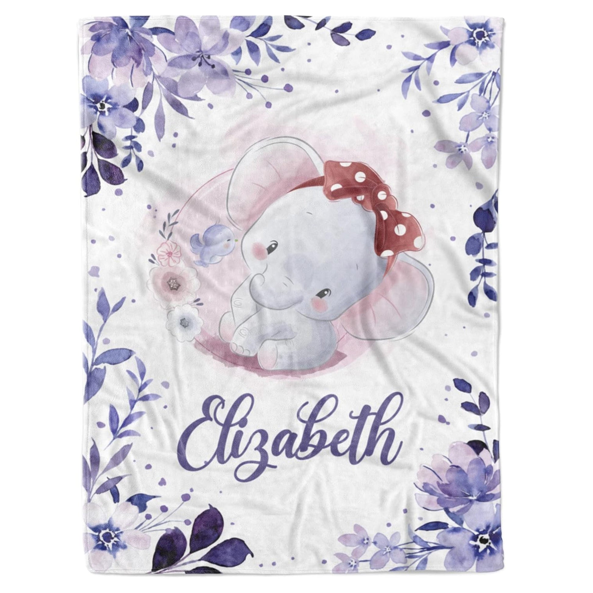 Featuring a baby elephant with rosy cheeks and a red polka-dot bow, framed by gentle purple florals. Your baby’s name is printed in elegant script, making this blanket a perfect keepsake.