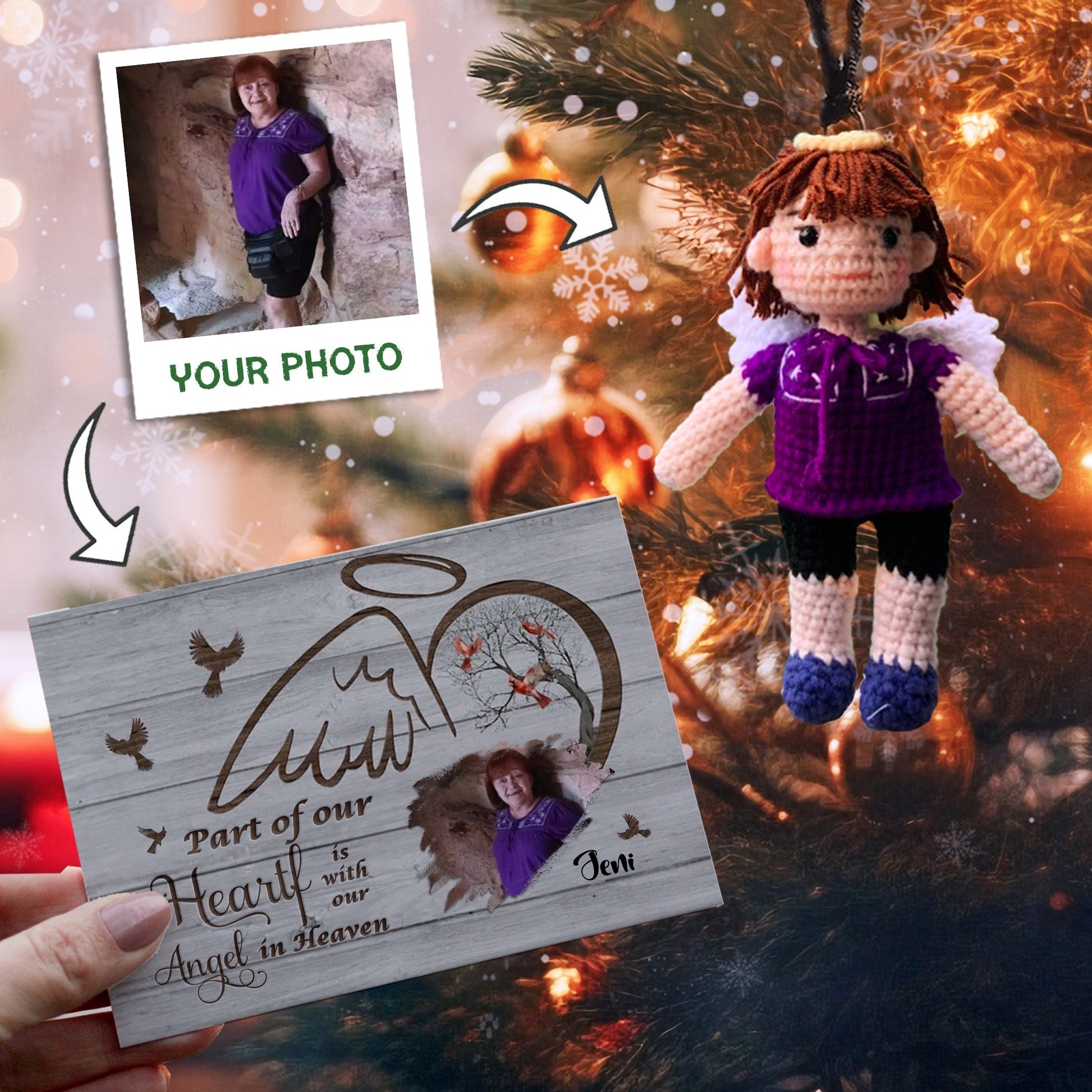 Personalized Ornament Crochet Doll with Photo Card "Part of our hearts is with our Angel in Heaven"